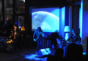 フロアの一角に設けられたライヴ・スペースに、さりげなくメンバーが登場する。そして、ごく自然な感じで、演奏が始まった。ラップトップを操る谷崎テトラと、アメリカン・ネイティヴ・フルートのMark Akixa、SUGIZOのヴァイオリンが静かに音を紡ぎ始める。リズム楽器のないゆるやかな音の集合体は、大地の呼吸を思わせる静かな調べで空間をそっと震わせる。バックに置かれたスクリーンに映し出される地球の映像と、3人の音がまるでシンクロしているようだ。