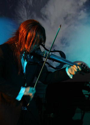 演奏にリズムが加わり、幻想的な雰囲気が徐々にプリミティブなグルーヴに変化していく。SUGIZOは時折ビールを飲んで、リラックスした表情。80パーセントはインプロビゼーションだという演奏は、3人の気持ちの高まりをそのままあらわすように、緩やかなカーヴを描いて高揚していく。SUGIZOのヴァイオリンはロック・コンサートの時と違い、静かな中に熱い炎を内包しているかのようだ。時折エキセントリックな叫びをあげるが、それすらも心地よく身体になじんでくる。