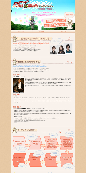 なお一次オーディションは、投稿された動画の中から選出された応募者が、10月18日放送のニコニコ生放送『ニコ生☆生うたオーディション』に出演し、マイク一本で1分間の歌唱によるアピール。審査は、視聴者による投票と、都倉俊一のほか、ボーカリスト・川村ゆみ、サウンドデザイナー・沖田純之介の3名の審査員により行なわれ、二次オーディション出場者を決定する。