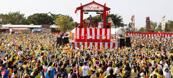 上地雄輔の地元、横須賀市内にある野外公園「ソレイユの丘」で行なわれた当イベントだが、オフィシャルファンクラブの「上地雄輔モバイル」から抽選で10000人が全国から結集、会場の駐車場には、広島、滋賀、いわき、三重、名古屋、新潟、京都…と、各地のナンバープレートがズラリ。北は北海道、南は沖縄、海外は韓国からもファンが駆けつけていた。