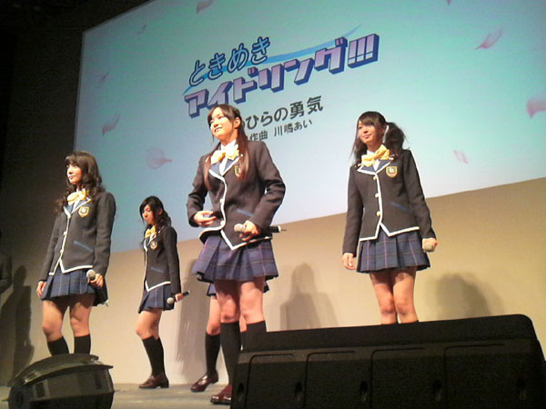 “ときめきアイドリング!!!”は、12月3日に発売される「ときめきメモリアル4」(KONAMI)のオープニング・テーマ「手のひらの勇気」(12月2日発売)を歌うために結成されたユニット。<東京ゲームショウ2009>当日は、会場の収容人数を大きく上回る1,000人以上のメモラー(ときメモファン)を前に、元気いっぱいに歌い上げた。