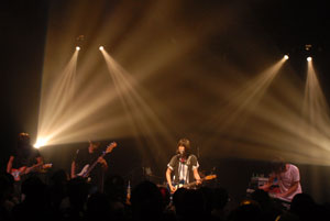 最初に登場したのはschool food punishment。内村友美(Vo、G)以外は男性という、今回のラインナップの中では唯一の男女混成バンドである。CMで大量にオンエアされた「butterfly swimmer 」が記憶に新しく、早耳リスナーの間では最も注目されているバンドのひとつだ。ポストロックを思わせる変則さをベーシックに、蓮尾理之(Key)がシンセで空間的なアプローチを表現する。ドラマチックな楽曲は特筆すべきもので、幅広いバリエーションで押し寄せる音の塊に、あっという間に客席を神秘的な世界へと導いていった。