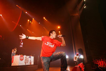 DJケミカルの「さわやかに行くぞ~!」という掛け声とともにスタートしたFUNKYMONKEY BABYSのライブでは、会場を埋め尽くす5,000人の観客が総立ちとなった盛り上がった。
