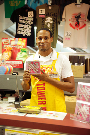 もともと音楽が大好きで、大学時代には米国のCDショップでアルバイトしていたというダンテ・カーヴァー、さすがに慣れた感じで「イラッシャイマセ」「ポイントカードありますか?」と、紳士的な対応。また、レジ打ちをしたり、他の商品を購入するお客様にちゃっかり『ワッツ・アップxザ・ファイネスト』を薦めたりする一面も。