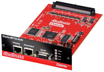 Audinate社製「Dante-MY16-AUD」はMini-YGDAI 規格に対応したネットワークオーディオカード。Audinate社独自開発のDante技術を用いて「Dante-MY16-AUD」一枚で16IN/16OUT(96kHzでは8IN/8OUT)のオーディオデータを伝送可能。さらにリダンダント接続にも対応する。