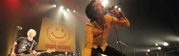 時間通りにイベントがスタートし、まずは、怒髪天の増子直純が本日限定オープンの“タワーレコード新木場店”店長として登場。いきなりのうれしいサプライズに大歓声だ。ライブ中は増子直純店長の呟きがタワーレコード公式twitterで公開されるという企画が発表された。「twitterのこと、さっき説明してもらったんだけど、うん、なんとなくわかったよ」と増子直純。写真とともにtwitterならではのゆるーい呟きがぽんぽんアップされていた。ピロウズが怒髪天のカヴァーをした際に呟かれた「パクられた」には、多くのロックファンが吹き出したことだろう。