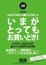 ハイ・リゾリューションは、取り扱いの独Ableton(エイブルトン)社の設立10周年を記念したキャンペーン「Able10」(エイブルテン)を2009年11月5日より、全国の販売店ならびにハイ・リゾリューションオンラインストアで実施する。 キャンペーンでは最大で15,000円オフとなる「Ableton Live 8」「Ableton Suite 8」特別パッケージを数量・期間限定で販売する。