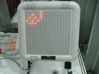 「TENORI-ON」は、アーティスト岩井俊雄氏のアイディアを組み合わせたコラボレーション製品として昨年5月に発売された製品。型番はホワイトLEDを使用していることから「TNR-W」と名づけられていた。今回発表されたのはその「TENORI-ON」のスタンダードモデルで、「TNR-O」という型番になっている。
