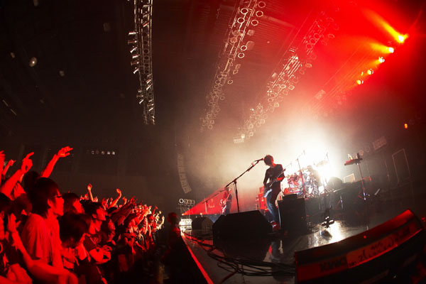 大方の予想を裏切り、静かに始まったこの日のライヴ。徐々に冷たくダークな時雨ワールドに引き込まれていったかと思えば、一変して疾走を始める轟音サウンドに狂喜乱舞する観客達。クールに繰り出される鉄壁のバンド・アンサンブルとは対照的に、感情の波に訴えかける高音ツイン・ヴォーカルの叫び、スリーピースとは思えない圧倒的な音圧感、楽曲の世界観を相乗して余りある照明演出にぐいぐいと嵌っていく。1曲ごとに怒号のような歓声と、その直後に訪れる固唾をのんだような静寂が繰り返され、不思議な緊張感に支配されたままライブは進行。途中、テレキャスターをアコースティックギターに持ち替えての楽曲や、ライブ初披露の新曲なども織り交ぜ、静と動のコントラストを鮮やかに描き出すステージングは見事だ。