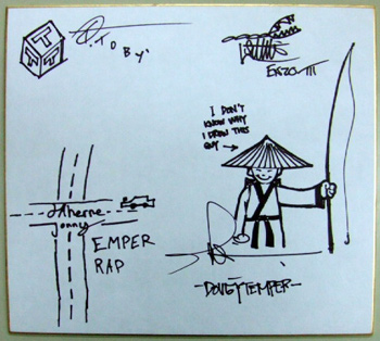 話がUKの女性アーティスト、バット・フォー・ラッシェズの話に及ぶと、ジョニーが「可愛いよね~」と一言。ダギーが「編集部の人だったら会う機会があるよね?」とこちらに話を振り、もう少しでザ・テンパー・トラップからの質問表を預かるというおかしな展開に。また、ダギーがひたすらうつむいてひたすらペンを握りだしたので何かと思ったら、サイン色紙にベトナム人風の絵を描いていた(しかも上手い!)。「なんでこれを書いたの?」と聞くと、「I DON’T KNOW WHY I DROW THIS GUY」(なんでこの男を描いたのか自分でもわからない)とサイン色紙に付け足す(笑)。それが今発売中のクロスビート12月号の読者プレゼントだ。