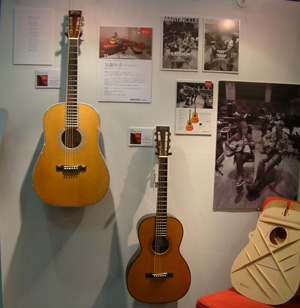 そういう世代の人が涙を流しそうな展示があった。それは先日、逝去されたミュージシャン加藤和彦のモデルCTM D-455M(写真:下 左上)だ。加藤氏の写真、追悼文とともに展示され、その横には、一緒にバンド“和幸”を組んでいたアルフィーの坂崎幸之助のモデル(写真:下 右下)も並んでいた。彼らのあの素晴らしい音楽は、マーティン・ギターによって作られていた。それも、マーティンが持つ歴史の一つである。