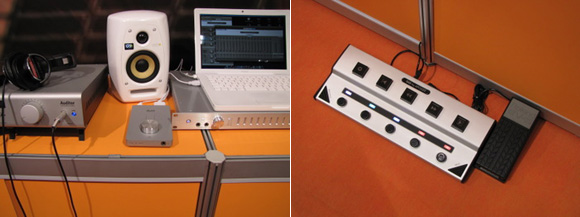 CrestAudio、PEAVEY、MediaMatrixなどのPA向け機器、レコーディングスタジオ向け機器としてはKRK SAYSTEMSのモニタースピーカー、NEUMANNのマイク、SPLのマイクプリなど数多くの海外ブランドの製品を展示するエレクトリ。個人ユーザーはAPOGEEのオーディオインターフェイスに注目。Mac専用でUSB接続のONE、シルバーのMacにぴったりのFirewire接続のDuetはいずれもトップパネルのエンコーダーノブが特徴。クリックでチャンネル選択、回すことでレベル調整が可能だ。その足元にはUSB接続のMac専用ギターインターフェイス&コントローラー「GiO」が展示。Apple Logic Pro 9、MainStage 2、GarageBand’09専用で、レコーディング機能の制御やプラグインのプリセット切り替えもできる。マウスに手を戻すことなくギター演奏に専念できるのがポイント。