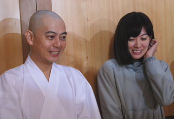これからクランクインというところで、撮影に対する意気込みを、「心意気はこの頭を見て頂ければわかるように、剃髪致しまして、“浄念”と名乗ります!」と早くも役に没頭。ともさかりえも「スネオさんの心意気を受け止めて、これから撮影ですので、予測がつかないところも多いですが、楽しんでがんばりたいです。」とエールを送った。