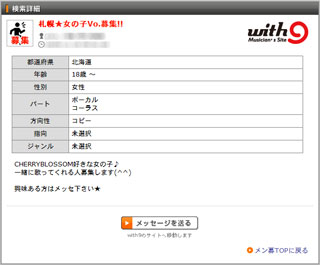 ジャンルは当然のこと、【コピー/オリジナル】や【プロ/アマ】などの指向も検索に加味することができるので、方向性の似たメンバーを探すことができる。長い活動の中で必ず出てくる「こんなハズじゃなかった」を比較的回避。年齢の上限~下限で検索をすることができる。気になるユーザーが見つかったらメッセージを送ってみよう(with9経由となるため、登録・ログインが必要)。