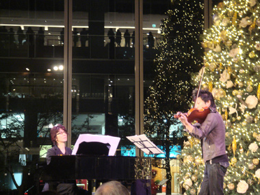 夕方5時半、辺りも暗くなった頃、全面ガラス張りの丸ビルマルキューブから見える街路樹に彩られたイルミネーションが輝き始め、満を持して吉俣良が登場。全長8メートルにも及ぶ巨大クリスマスツリーをバックに、2009年高視聴率を記録したドラマ「救命病棟24時」から「Smoke In The Lounge」をピアノソロにて披露。続いてMCを挟み、バイオリニスト真部裕とともに「カンパニュラ(風のガーデンメインテーマ)」「COTO」を始め、ドラマとともに大ヒットとなったサウンドトラックから人気の曲を次々と披露。吉俣良の優しいピアノに、真部裕のシャープなバイオリンの音色が交わり、輝くイルミネーションとの相乗効果も相まって、会場のムードは最高潮に。