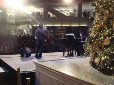 現在、年内の週末を中心に丸ビルで行なわれている音楽イベント<Bright Christmas 2009>に、吉俣良が登場、300人以上ものファンで会場を埋め尽くした。このようなオープンスペースでフリーライブを行なうのは東京では初のことだ。