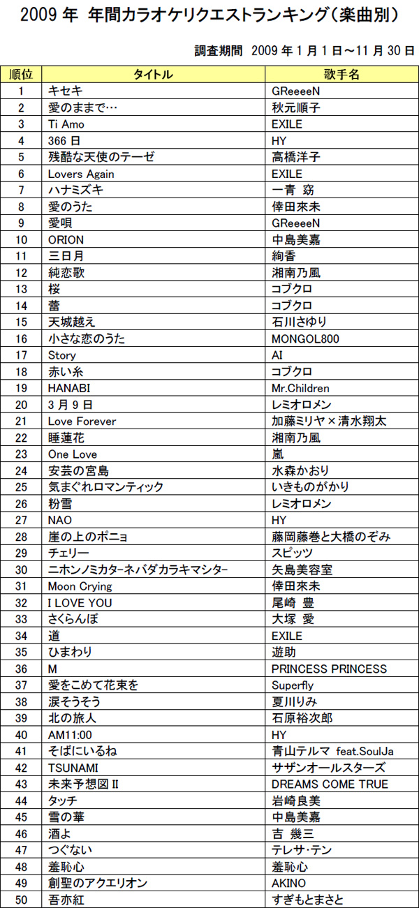 2009年間カラオケリクエストランキング発表 ~画像編~