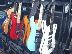 | ▲ギターはキラー。メイプルネックの24フレット、ハム・シン・ハムのフロイドローズが基本の仕様のようだ。 |