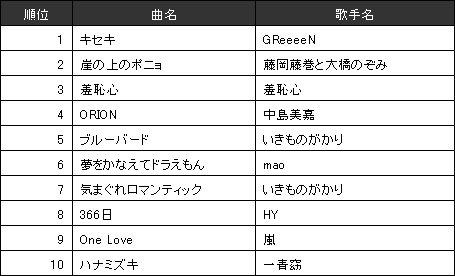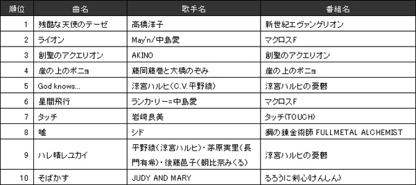 一方、(4)アニメ/特撮/ゲームランキングに関しては、2008年に引き続き、映画やパチンコ・スロット等で話題となった『新世紀エヴァンゲリオン』から「残酷な天使のテーゼ」が1位を獲得。また、『マクロスF』や『涼宮ハルヒの憂鬱』など人気の高いアニメが上位にランクインしており、鉄板作品の目白押し状態。