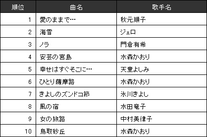(6)演歌/歌謡曲ランキングに目を向けてみると、2008年末の音楽番組出場をきっかけに、2009年に入ってから飛躍的にランキングが急上昇した秋元順子の「愛のままで…」が見事に1位を獲得。引き続きジェロの活躍も見事。超定番作品というよりも最新動向がランキングに反映している様子は、演歌ファンもJ-POP同様、常に最新の作品を求め続けている様子が伺える。