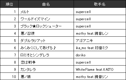 近年目を見張る動きを見せているのが(7)VOCALOID系ランキングだ。初音みくをはじめとした音声合成ソフトを駆使しての作品は、音楽制作の既得権を破壊し一般音楽人が、世界中の音楽シーンを席巻する奇跡をも生み出していった。動画共有サイトで人気が出たことでJOYSOUNDに入曲した楽曲のランキングが以下のとおり。supercellの強さはもはや圧倒的といえそうだ。
