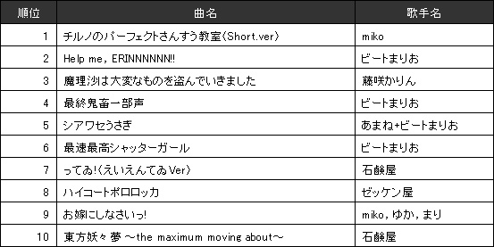 (8)東方系ランキングは、同人サークル「上海アリス幻樂団」によって制作された『東方Project』と総称されるゲームのBGMを元に、主に一般のユーザーが曲をつけて、インターネット上や即売会等で人気が出た楽曲群だ。こちらもVOCALOID同様、これまでの音楽シーンには浮上してこなかった興味深いデータのひとつ。