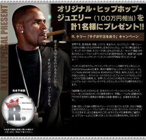 世界不況、経済危機、倒産、リストラ、賃金カット…暗いニュースに覆われる2009年冬の日本、そんな冷え込む心と懐を温めるべく、R.ケリーが「サグが不況を救う」と銘打ち、1名にオリジナル・ヒップホップ・ジュエリー(100万円相当ペンダント)をプレゼントしてくれるという。