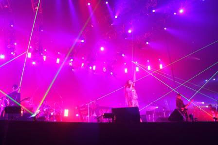 ライヴ後半戦、「How Do I Survive?」では志帆の振りに合わせて観客もダンス!「誕生」では志帆が赤いライトの下ステージを全力で走り回り観客も熱狂。なにより圧巻だったのは「Alright!!」だ。暗闇の中Superflyと書かれた赤い電飾がステージバックに輝く中、突然ステージ中央がせり上がり現れたのは全身キラキラゴールドのミニワンピースに身を包んだ志帆。アルバム1曲目と同じドラムのビートが刻まれると会場の熱気は最高潮となり、「ナナナ~」と「Oh Yeah!」の大絶叫。志帆もロックスター然とした堂々としたパフォーマンスで観客を煽っていく。そして本編ラストに披露されたのは、最新シングル「Dancing On The Fire」。「みんな思いっきりDancingしようじゃない?」という志帆の言葉通り、レインボーに輝く電飾の下武道館は一気に、80年代ディスコのようなキラキラを纏った大きなダンスフロアへと変貌を遂げた。