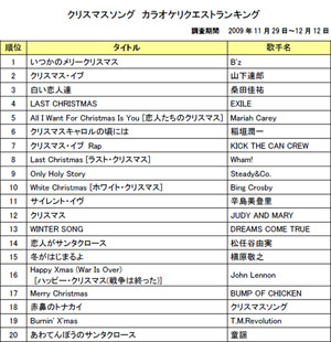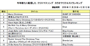 2009年、1位はB’zの「いつかのメリークリスマス」、2位は山下達郎の「クリスマス・イブ」、3位は桑田佳祐の「白い恋人達」。カラオケでのクリスマスソングの定番とも言える名曲が、上位3位をがっちり守った形だ。