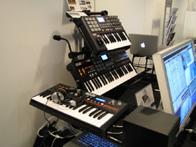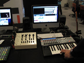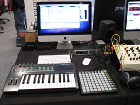 | ▲エムアイセブンジャパンではPropellerhead Reason、RecordとOberheimのアナログシンセSEM(SYNTHESIZER EXPANDER MODULE)を合わせて展示。MIDI信号をCV信号に変換してコントロールしているという。 | ▲Novationのハードウェアも展示。写真左がファタール製鍵盤搭載のNocturn 25、右がABLETON Live用コントローラーLaunchpad。 |