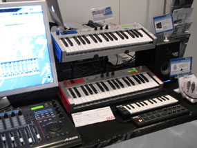 | ▲プロ・オーディオ・ジャパンではALESISのオーディオインターフェイス&コントロールサーフェスMASTER CONTROL、シンセサイザーMicron(限定カラバリの青も!)、AKAI PROFESSIONALのコンパクトなUSBコントローラLPK25とLPD8など。 | ▲AKAI PROFESSIONALブランドでは、多彩なコントローラを搭載したUSB対応キーボードMPKシリーズやABLETON Live用コントローラAPC40、そして発売されたばかりの小型のバーチャル・アナログ・シンセMINIAKも展示。 |