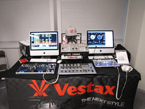 ベスタクスのDJブース然とした展示は、USB MIDIコントローラーVCM-600、DJコントローラーVCI-300&VFX-1、赤い小型オーディオインターフェイスTANK(VAI-80)などが並ぶ。iTunesでDJプレイができるSpin(写真右)ももちろんあり。