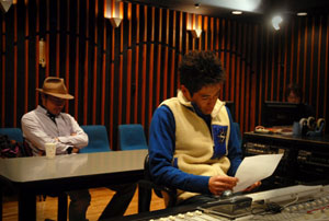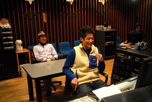 佐藤隆太はレコーディングスタジオを電撃訪問し、数日前に完成したばかりの主題歌を誰よりも早くスタジオにて視聴した。写真はそのときの様子だ。