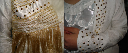 リボンを1本1本ほどいて作ったフリンジ(写真左)。かしめは袖口にもきれいについてます(写真右)。