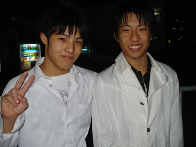 男同士で来ているファンの人たちも目立ちました。写真は、学校帰りに新木場へ駆けつけたというりゅーいちクンとりゅーやクン。「沙我さんのファンです。ベースはうまいし、カッコイイし、弾き方もセクシーで憧れます」(りゅーいち)、「僕は将さんのファン。あの歌い方とかパフォーマンスが好きです」(りゅーや)