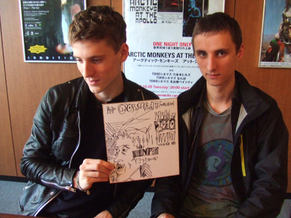 例えばこっちが通訳さんの言葉に耳を傾けていると、何やらごそごそと物音が。振り返って確認してみると、兄ジャックが椅子の高さを調節し、2人の座高が全く同じになっていたりする(笑)。しかも2人とも、満面の笑みでかなり楽しそう。ジャックが2月号のプレゼント用サイン色紙(写真)にジョージの横顔を描いてくれたが、結局ちょっとグロテスクになってしまったのも、彼が集中して凝り過ぎてしまったゆえだ。また取材終了後に写真を撮らせてもらうと、映りに配慮してテーブル上の荷物をさっとどけてくれたりと、終始フレンドリーで楽しげな雰囲気だった。