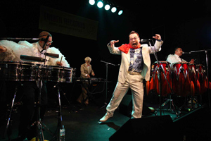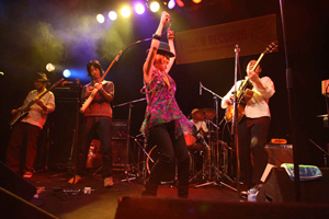 そのまま時間を空けずに登場したのは東京パノラマ マンボ ボーイズ。ド派手な衣装と佇まい、そしていきなりのボヤきに、観客も動揺(笑)している様子。ただし、数秒後には「ウーっっっ!」と、腕を高く振り上げ、全力で彼らのボヤきに全力で応えていた。最後はタワーレコードの黄色いタオルを客席にバンバン投げ入れる大盤振る舞いでおおいに客席を沸かせたあと、フリフリの衣装を揺らしながら颯爽とステージを後にした。