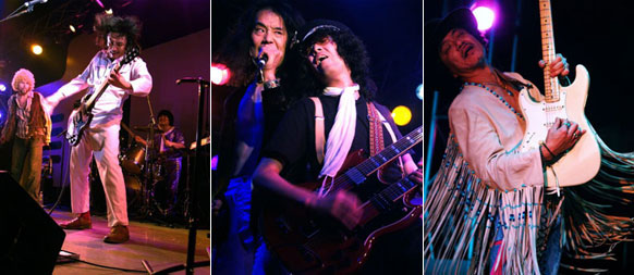 ライブ後半はCD第一弾に収録されたTOWNZEN(写真:左)、MR.JIMMY(写真:中)そしてJIMISEN(写真:右)が登場。楽器や音のみならず、衣装、ステージ・アクションにまで徹底的にこだわり、コピーバンド・ものまねといった領域を軽く超え、現在の本人より本人らしい“トリビューター”ならではのステージで、この日集まったリアルタイマー世代から10代のカップル、さらには外国人まで、幅広いロックファンたちを魅了した。