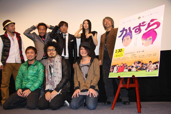 かりゆし58にとっても初の映画主題歌となる新曲「雨のち晴れ」は2月3日に発売となるが、その映画『かずら』の完成披露試写会が1月12日に都内で開かれ、舞台挨拶には、主演のさまぁ~ずの三村マサカズと大竹一樹の他、ヒロイン役の芦名星、監督の塚本連平、かりゆし58が参加した。
