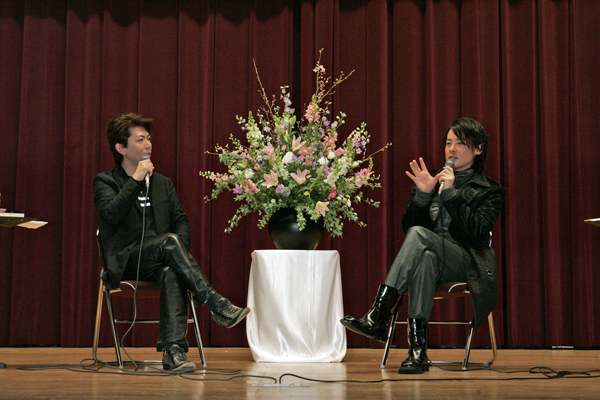 90分の講義はふたりの対談形式で進められ、お互いの作品の創り方の共通点や違いなどが、これまでの経験を交えながらわかりやすく伝えられた。300万枚売れたヒット曲もつ河村隆一と、300万部のベストセラーをもつ泉忠司という300万×300万の稀代のコラボレーションという事も手伝ってか、訪れた学生の表情も真剣そのものだった。