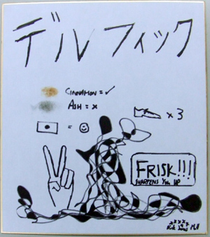 まずはドーンと上部に書かれた「デルフィック」の文字。サインをお願いするなり「日本語でどう書くの?」と確認してすらすらと書き始めたのだが、実はかなり上手い。そこにマット・コックセッジ(G)が吸っていた煙草をジュッと押し付け、カフェのテーブルにあったシナモンを付けて「Cinnamon=✓、Ash=✗」という部分が完成。ついでに食べていたFRISKのケースで型を取って、等身大FRISKが完成した。