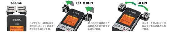 「VR-20」ではユニークな可動マイク機構の採用に注目だ。上部のマイクが左右に開くことができるようになっており、状況に応じてこのマイクポジションを変えることで、音源に合わせた最適な録音が行えるというもの。たとえば、マイクを閉じると、インタビュー、講義の録音などピンポイントの音源の録音に最適なX-Yステレオ方式のインタビューポジションとなる。マイクを開いたA-B方式ステレオ録音となり、2種類のポジションが用意される。卓上に置いた際にマイクを上に開いた状態にするカンファレンスポジションは、会議録音など広範囲音源の録音に最適なもの。そして、マイクを前方に向けた場合はコンサートなど左右の広がりがある音源の録音向けとなり、ミュージックポジションと名付けられている。一方の「VR-10」のマイクは手軽に高音質の録音が行える無指向性マイクを採用する。