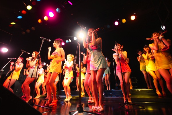 夕方と夜の2回公演でそれぞれ500人ずつのファンを集めて行なわれたこのイベント。ステージ上に、CDジャケットのような露出度多めの衣装で恵比寿マスカッツの25人が登場すると、拍手と歓声が巻き起こる。