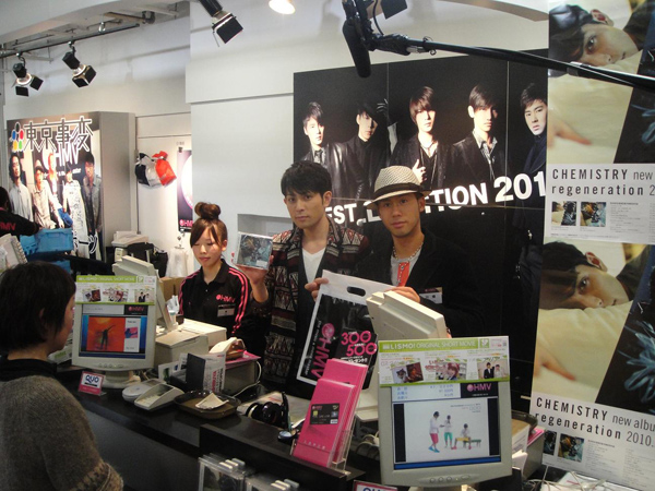 2月24日に約2年ぶりとなる最新アルバム『regeneration』を発売したCHEMISTRYが、アルバムが店頭に届く2月23日にHMV渋谷に登場、アルバムタイトル『regeneration』にちなみ、『regeneration』をお買い上げのお客様に、自らレジ業務をつとめた。このサプライズ企画、その名もレジストリー。美輪明宏がコンビニの店員だった場合も驚くが、2人そろってのCHEMISTRYのレジ係も相当のインパクトだ。