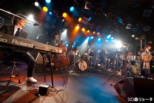 ファンで埋め尽くされ満員となった会場に、19:50いよいよステージにはクオシモードの4人、平戸祐介(Pf、Key)、松岡”matzz”高廣(Perc)、須長和広(B)、今泉総之輔(Dr)と4人のサポート・メンバーが登場となった。