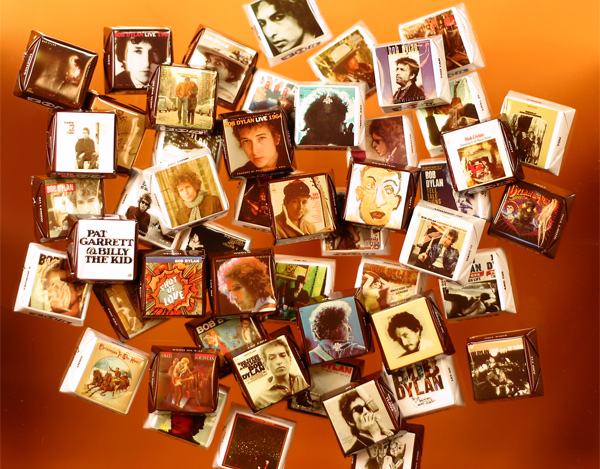 小さなチロル・チョコを50種のボブ・ディランの名盤ジャケットでくるみ、25種類づつを2つのスペシャル・ボックスに入れた形で発売。箱の色もホワイトとブラウン、2つを並べると50種類のジャケットが年代順に見事に並ぶ形となる。チョコの四方にはボブ・ディランの歌詞の一部も記され、見ているだけで笑みがこぼれ、テンションがダダ上がりになる、すばらしい出来栄えだ。