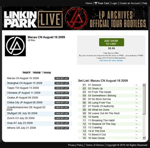 現在ニュー・アルバムを制作中のリンキン・パークが、2007年から2009年の間に行なったライヴの音源を公式ツアー・ブートレッグとしてダウンロード販売している。販売サイトdownloads.linkinpark.comでは3年間分、100公演以上に及ぶ音源がアーカイヴ化されており、全公演のセット・リストも閲覧可能だ。