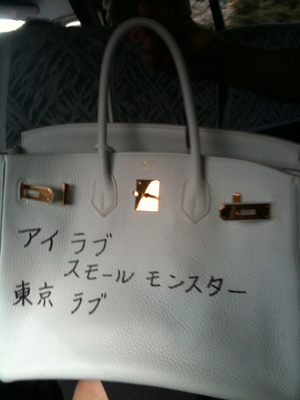 チャコールグレーの2ピース・パンツ・スーツに身を包んだガガは、エルメスの白のバーキンバッグに日本語で「アイラブスモールモンスター東京ラブ」の文字をなんとマジックで手書き。エルメスだぞい、エルメスっ。