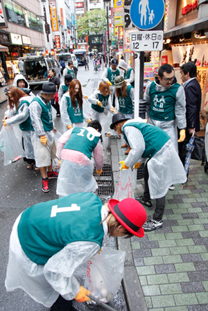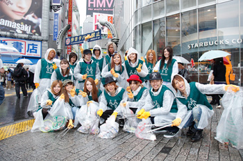 当活動は、NPO団体green birdのバックアップのもとで行なわれ、メンバー、green bird STAFFに加えファン50名も応援のために集合、雨の中、渋谷の街を2時間かけてきれいに清掃していった。渋谷ではかなりの知名度を誇る両アーティストだけに、街頭でゴミを拾う姿を見た若者は皆、振り返り、中には一緒にゴミ拾いを手伝いだす女子中高生も現れた。