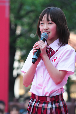「私は今日、朝ケータイを家に忘れてきちゃって、すごくショックで今すぐお家に駆けつけーたい。あの…ケータイだけに“駆けつケータイ”(会場から驚きの声)。そんなダジャレが好きな高校1年生、前田憂佳です!」── 前田憂佳(ゆうかりん)